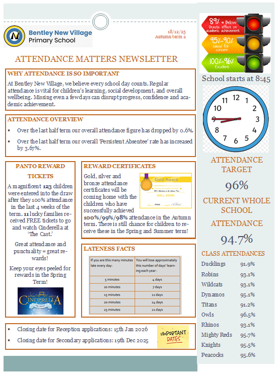 Here at Bentley New Village we appreciate the unique difficulties that parents and carers face in regards to having good attendance and we take pride in supporting families with these difficulties and support them with addressing any barriers they may face. We embrace positive attitudes towards attendance and as a school we aim to promote this through our staff and our school ethos.